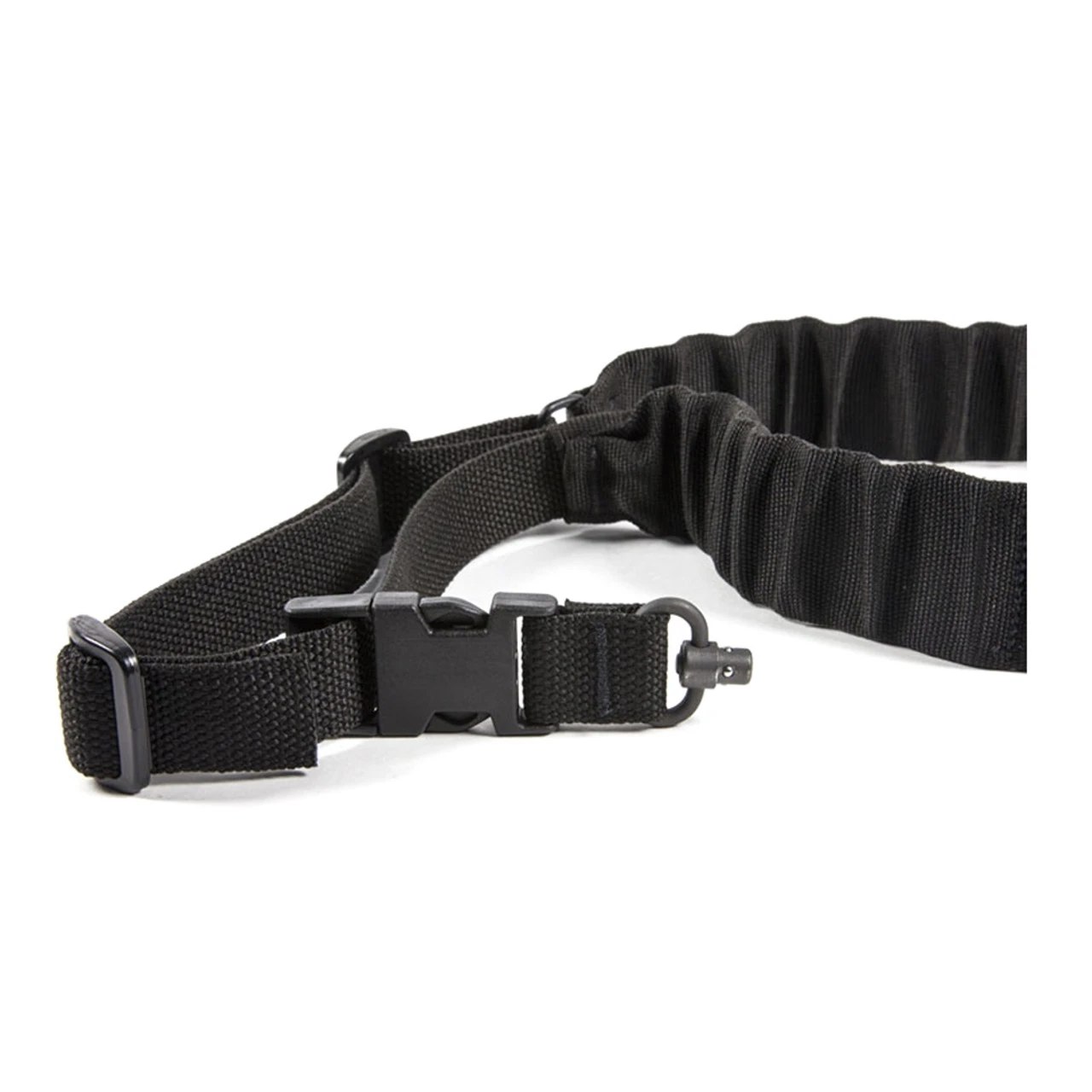 The bungee has a travel of approximately 2″ – enough to absorb shock from movement or transitions but short enough to reduce the risk of facial injuries or sagging weapons. The overall length is adjustable, ambidextrous, and compatible with use over body armor.