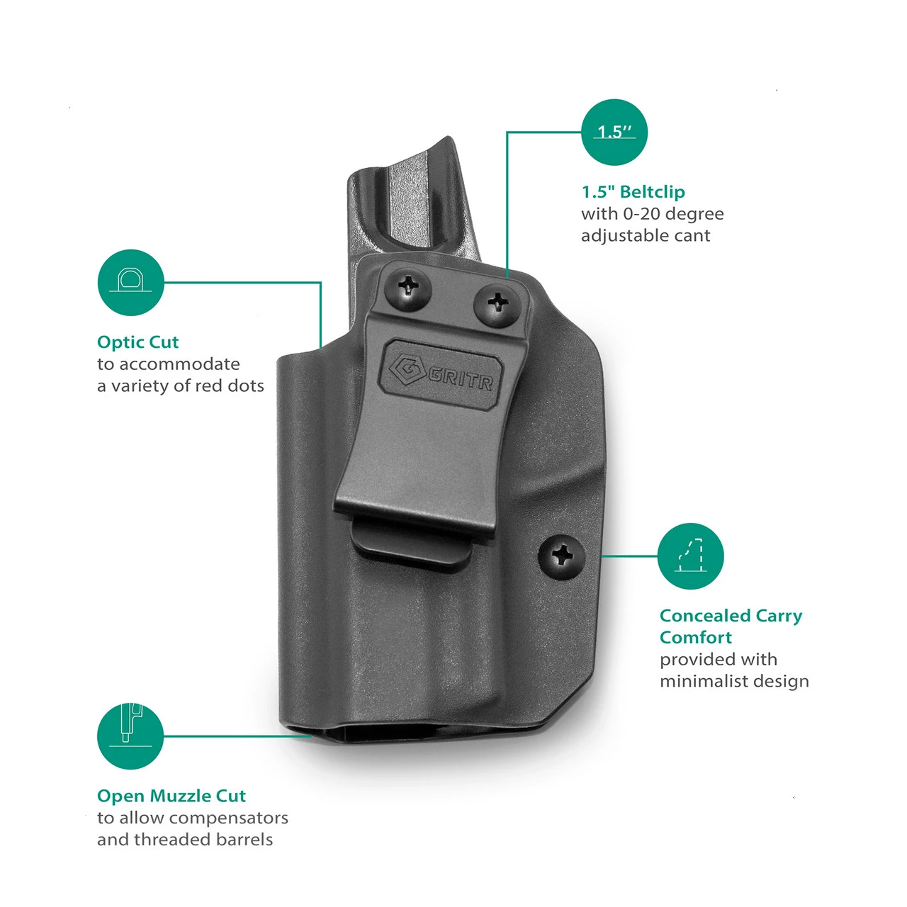 RED DOT & COMPENSATOR COMPATIBLE – All GRITR holsters are designed to accommodate a wide range of red dot sights and various compensators with the open bottom design. Allowing you to customize your gun the way you want and still have a great holster to accommodate it.
