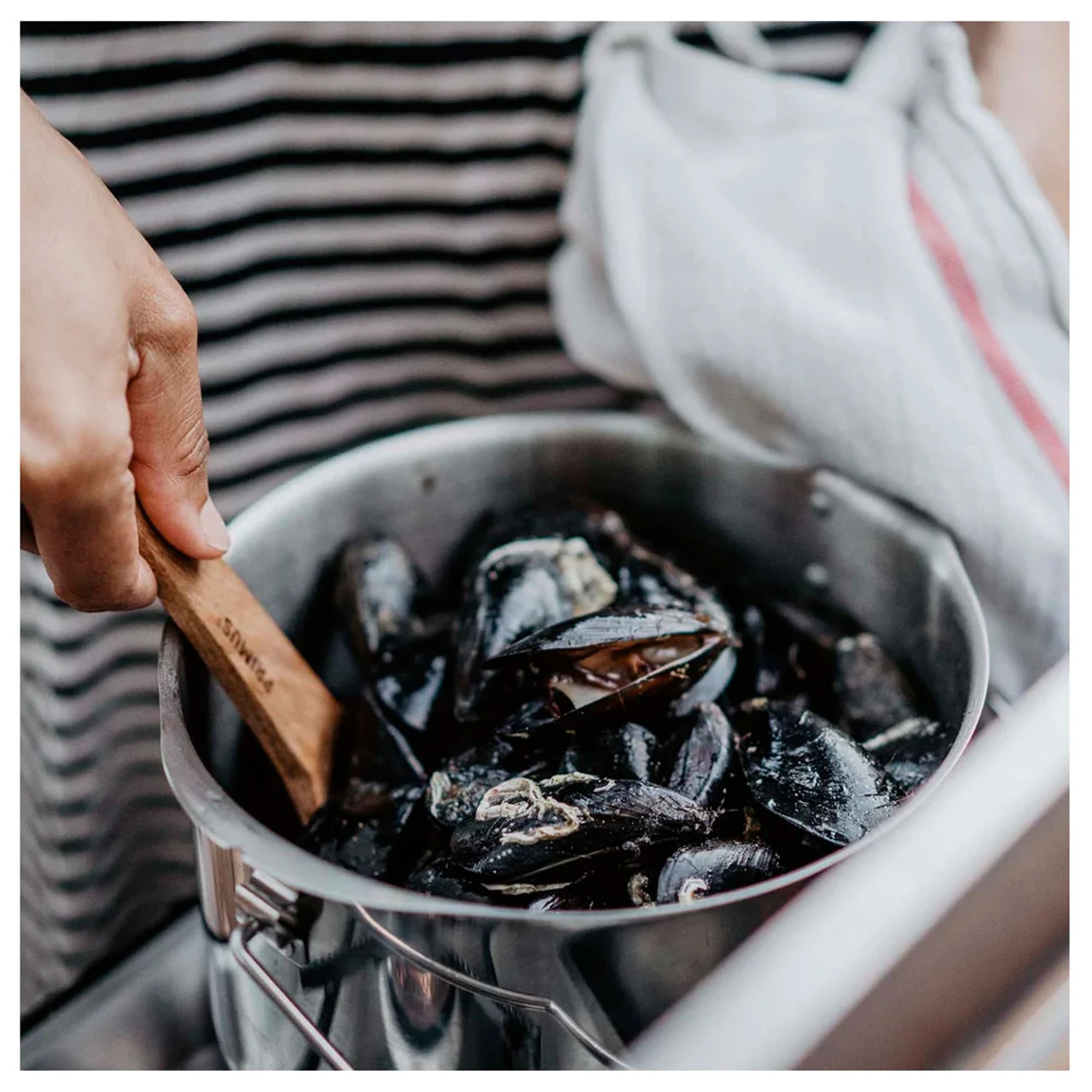 - Stainless-steel lid with a leather tag makes it easy to check the contents while an integrated colander strains any camp meal