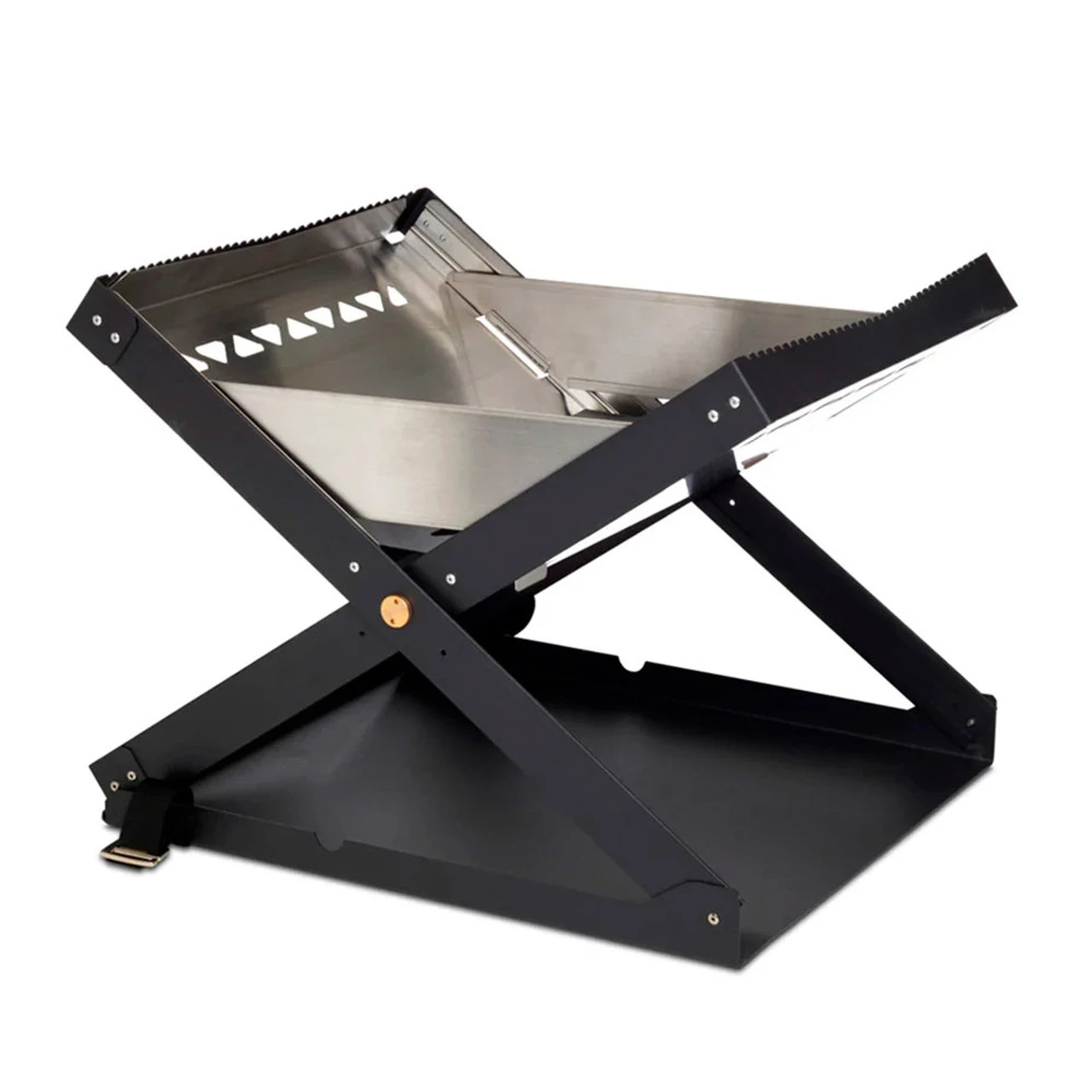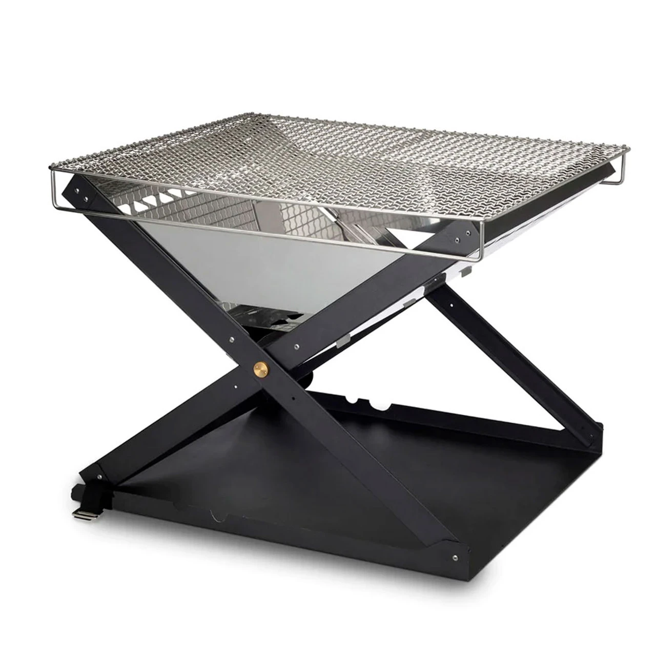 In addition to any campsite or rafting rig, this leave-no-trace, use-anywhere fire pit is ideal at the beach, your backyard, or even a parking lot tailgate party. The integrated ashtray/base protects the ground from heat or embers. A removable grill grate is ideal for open-fire cooking. The powder-coated frame is stable and robust for countless campfires. The stainless steel windshields and the air inlet tray combine for efficient combustion.
