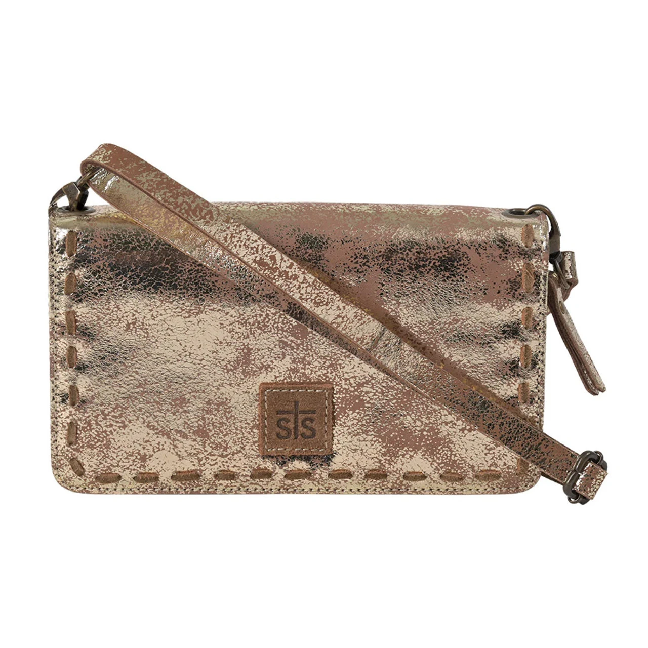 The STS Flaxen Roan Evie Organizer (31182) is crafted in a golden, metallic full grain leather that is buffed for a casual feel and finished with a glamorous, golden metallic shine. This model has an adjustable and removable leather crossbody strap.