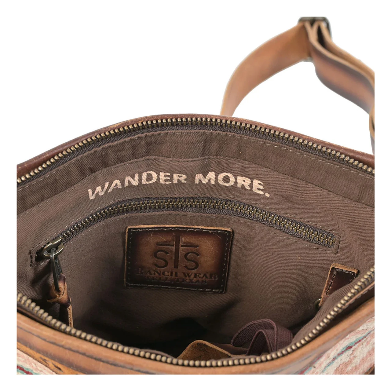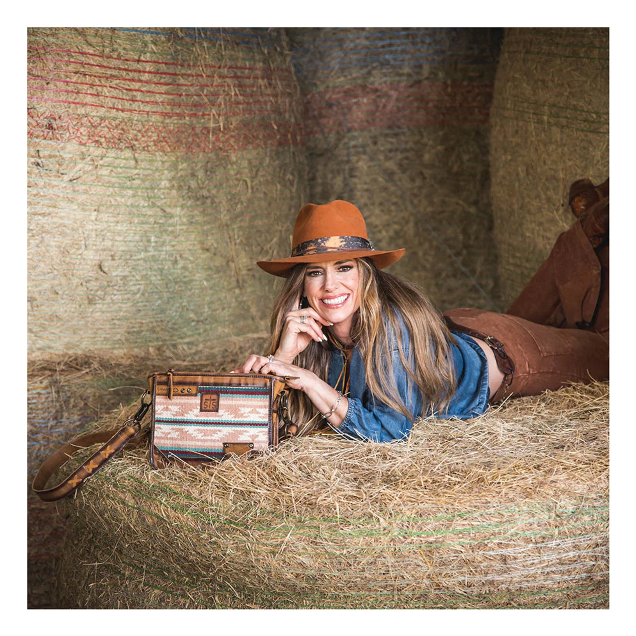 The STS Palomino Mae Corssbody Shoulder Bag features Aztec woven serape with genuine leather accents for a touch of Western flair; adjustable leather crossbody strap with buck stitching accents.