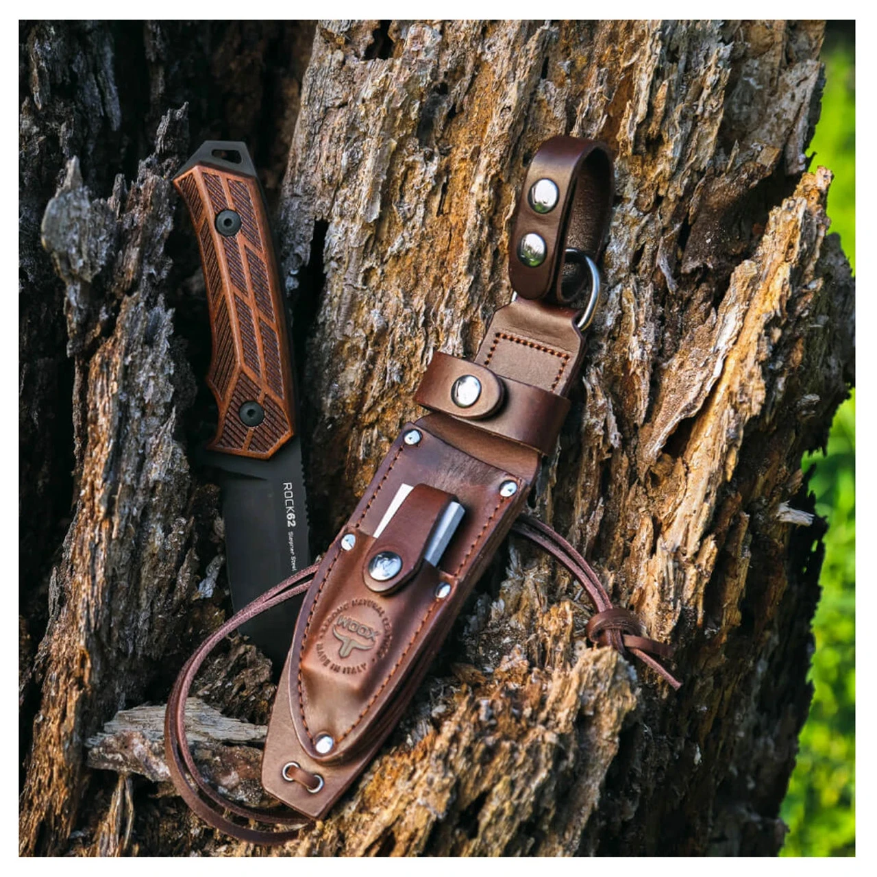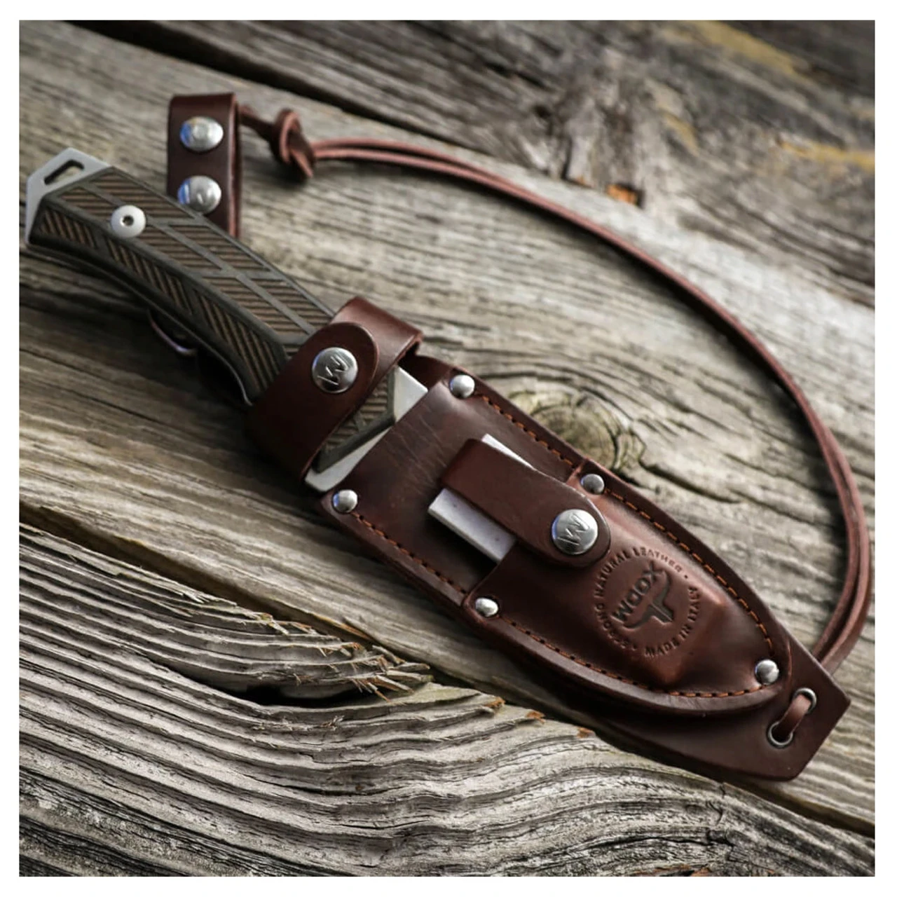 Store your knife in a handmade sheath crafted in Tuscany from genuine Italian leather. Featuring a whetstone pocket, your sheath will hold its own, buckled to your utility belt or backpack out in the field.